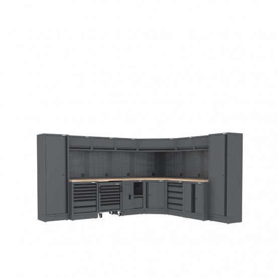 • Durchdachte Ausstattung mit Schubladenmodulen, Wekrzeuglochplatten, Hängeschränken und vieles mehr - Eckausführung